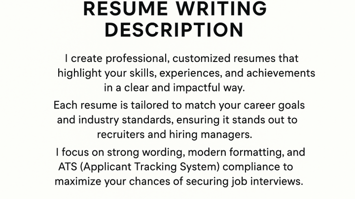I create professional, customized resumes that highlight your skills, experiences, and achievements in a clear and impactful way. Each resume is tailored to match your career goals and industry...